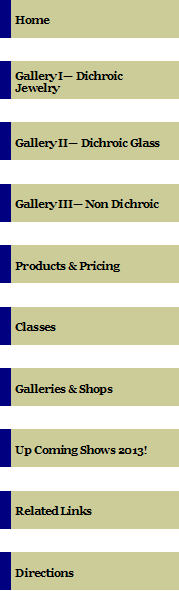 Home | Gallery I-- Dichroic Jewelry | Gallery II-- Dichroic Glass | Gallery III-- Non Dichroic | Products & Pricing | Classes | Galleries & Shops | Up Coming Shows 2013! | Related Links | Directions |